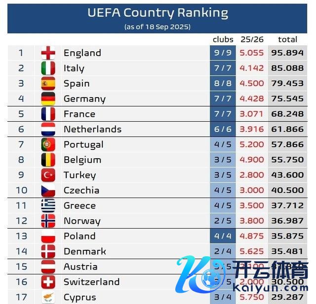 直播吧9月19日讯 欧冠联赛阶段首轮也曾完赛,相干机构也统计了本赛季的欧战积分情况,并更新了欧足联旗下各协会的积分名次。英格兰依然独自领跑,而意大利第二的位置仍暂时稳重,但额外上风有稍许松开。