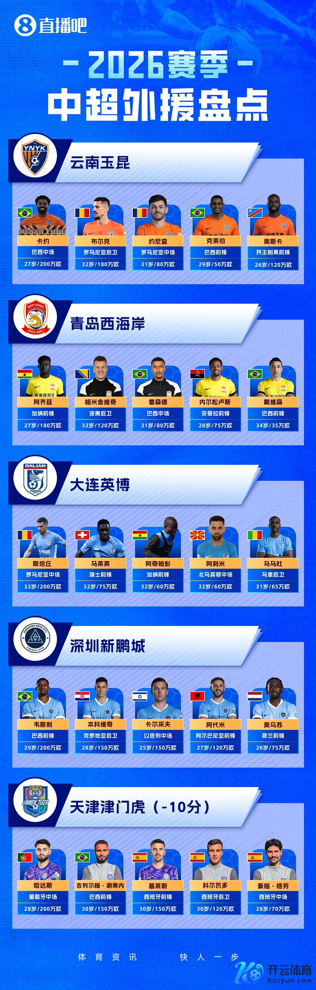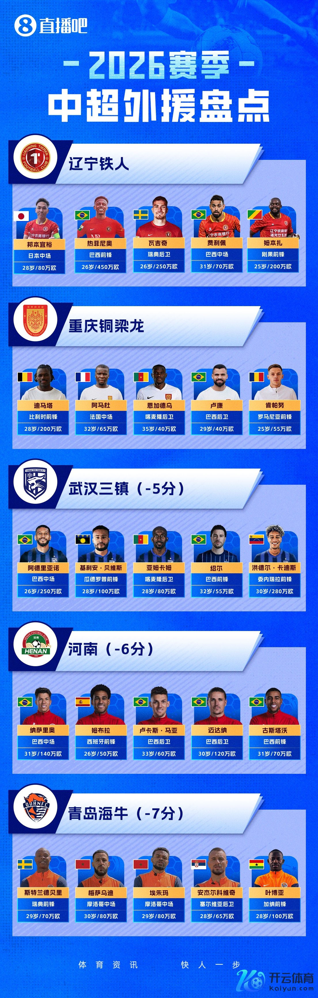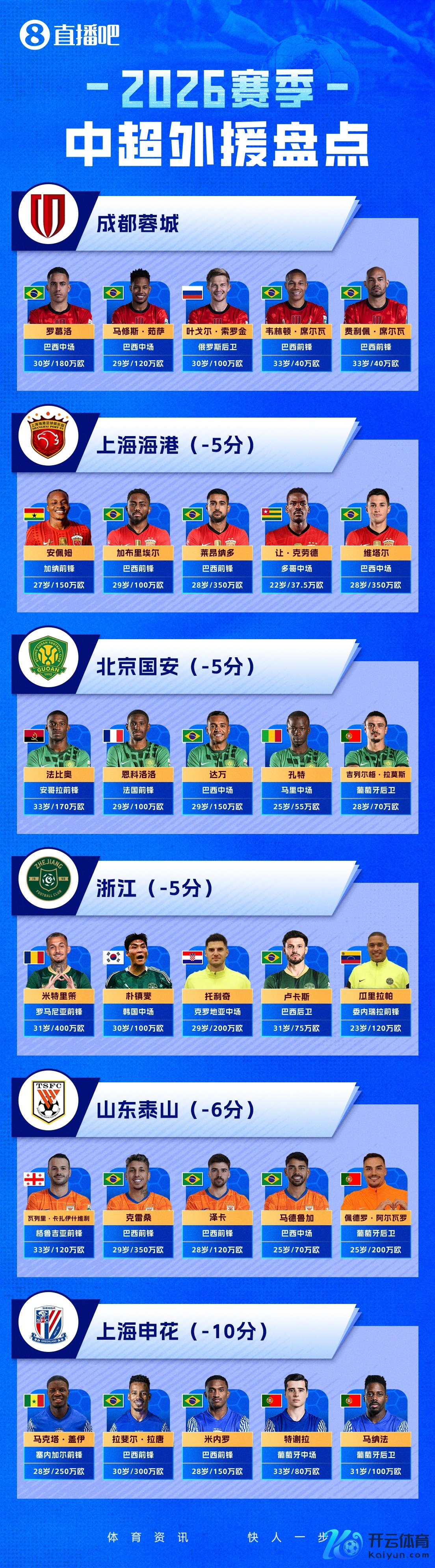 2026赛季中超行将开幕让球网体育信息,转会窗口关闭之后,16家中超球队的外助也已一说念详情。一图流清点了系数的中超外助,仅需一图即可掌捏他们的国籍、位置、年纪、身价等信息。