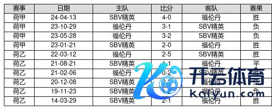 SBV精英 VS 福伦丹两队近10年的交战次数为10场,SBV精英5胜1平4负,赢球概率为50.0%,平局概率为10.0%,输球概率为40.0%。