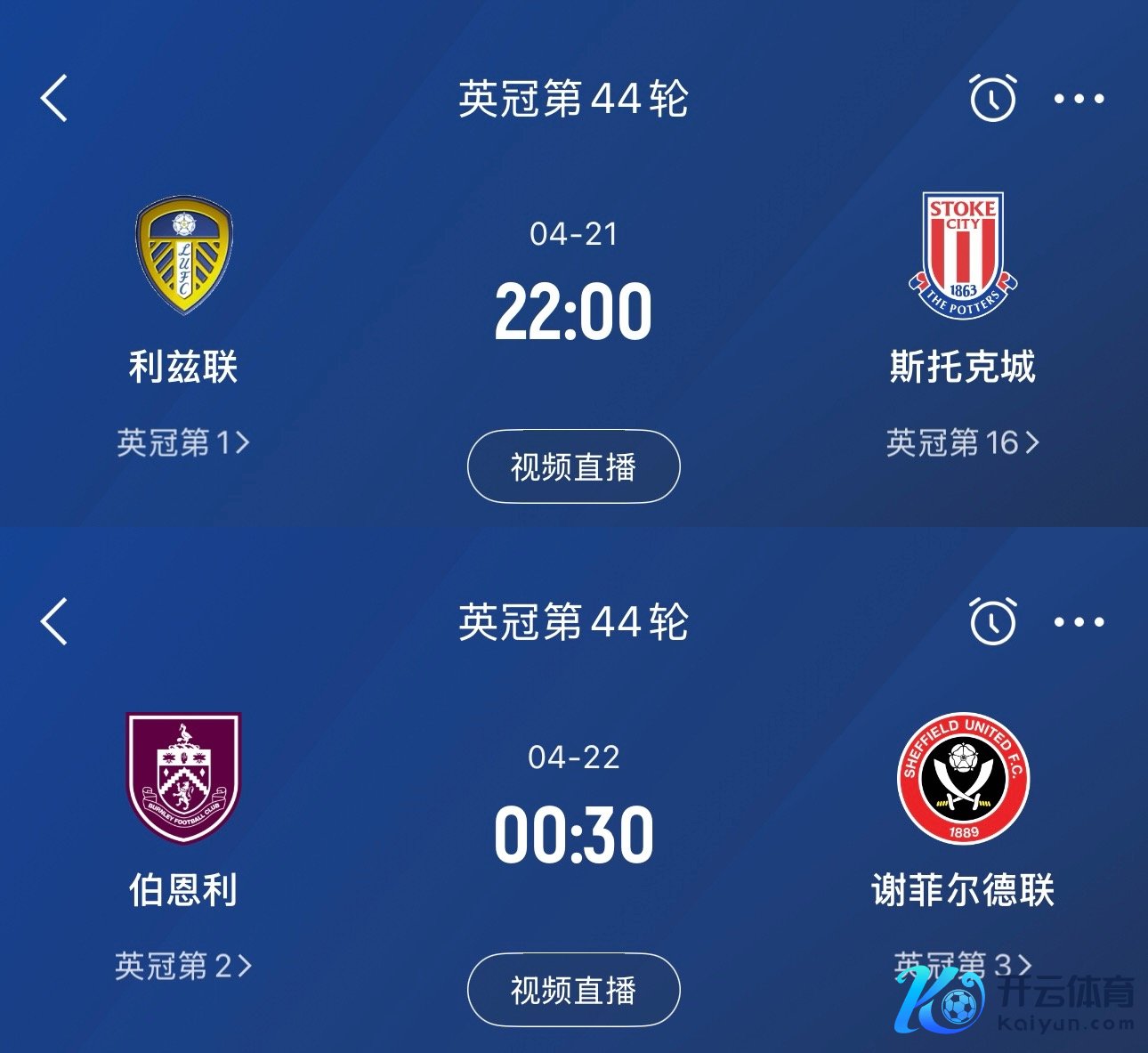 下轮英冠在4月21日至22日进行,利兹联(第1)对阵斯托克城(第16),伯恩利(第2)对阵谢菲联(第3)。要是利兹联和伯恩利下轮双双赢球,两队将同积94分,剩2轮跨越第三谢菲联8分,锁定前二联袂直升英超。