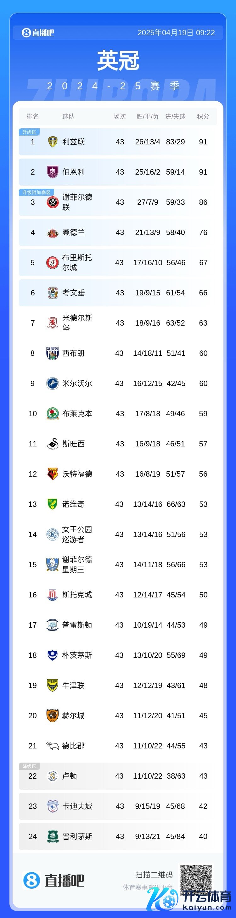 04月19日讯 英冠第43轮战罢,升超场地已相配开朗,利兹联、伯恩利91分名次前二,剩3轮跨越第三谢菲联5分。