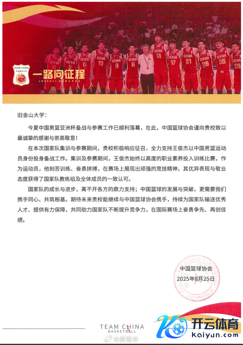 虎扑10月16日讯中国篮协当天向旧金山大学发布感谢信,信中示意:王俊杰以中国男篮斥地员身份投身备战使命,优异推崇得到国度队全员认同;但愿今后抓续为国度队运输优秀东谈主才。