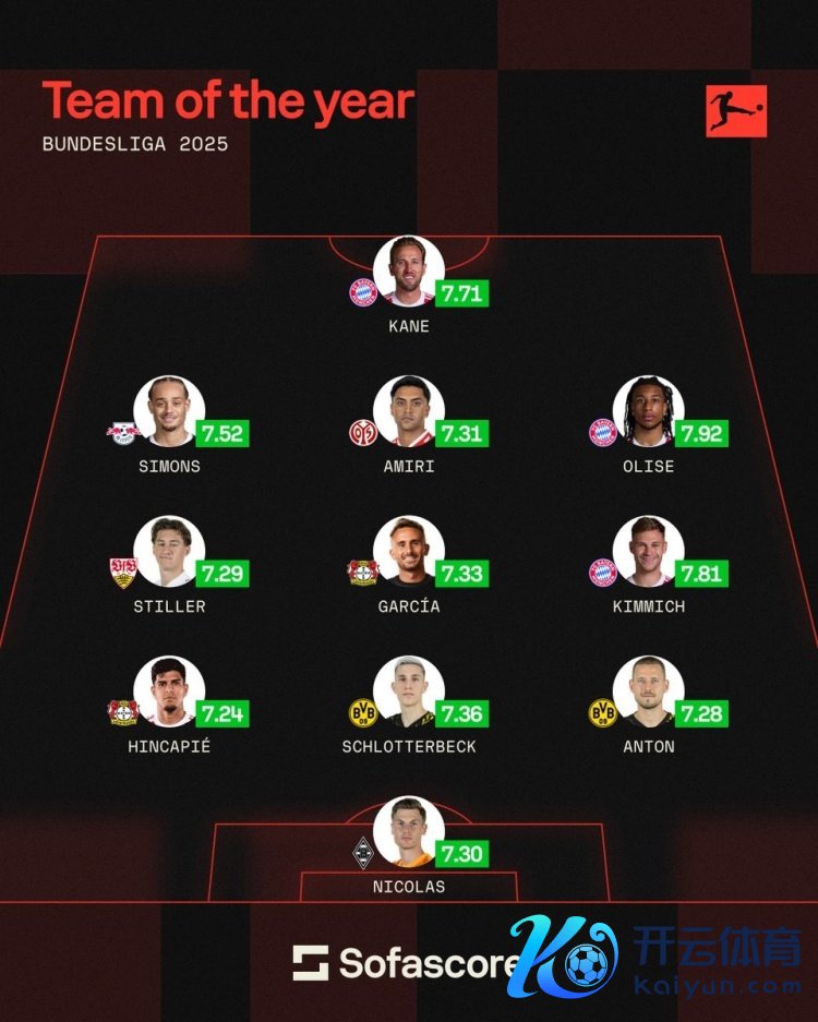 12月29日讯 sofascore统计了今年度德甲评分最好阵,拜仁3将在列、多特蒙德和勒沃库森2东说念主,其中2东说念主已转会英超。