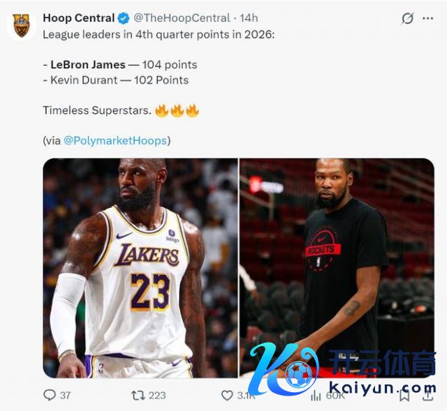 在湖东说念主间隔公牛逆转的赛后,好意思媒晒出投入 2026 年后,勒布朗小节 104 分定约第一,杜兰特小节 102 分定约第二,勒布朗 41 岁乐龄,杜兰特 37 岁乐龄,时光一晃眼畴昔了 10 多年,可詹杜双皇依旧炸裂。