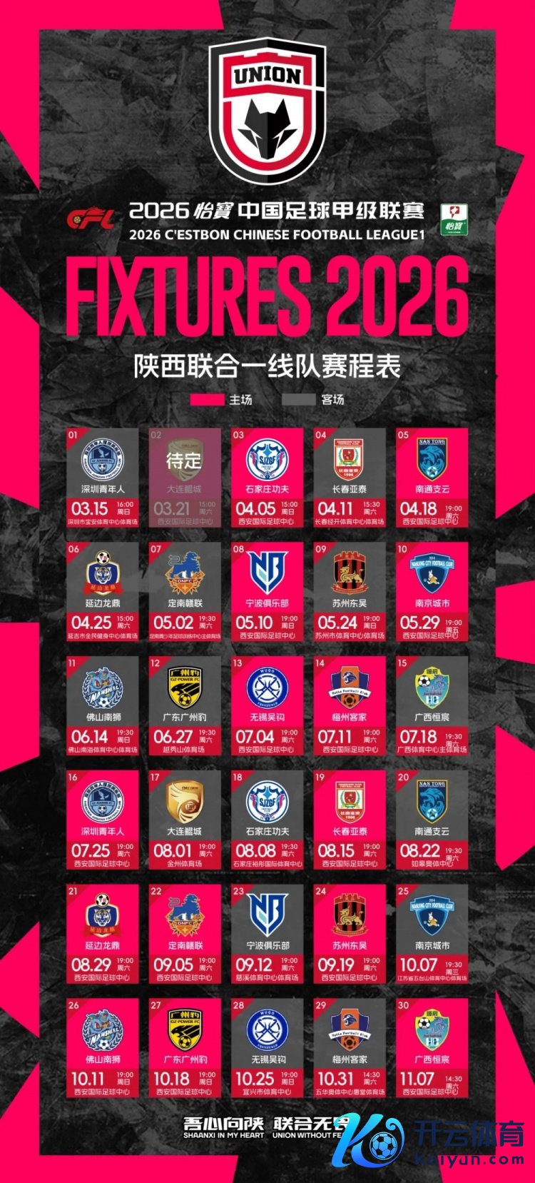 陕西连合首轮比赛于3月15日打响,赴客场挑战深圳后生东谈主;原定于3月21日的首个主场比赛日可能推迟,具体补赛日历待定;收官战将11月7日于主场对阵广西恒宸。以下为详备赛程信息: