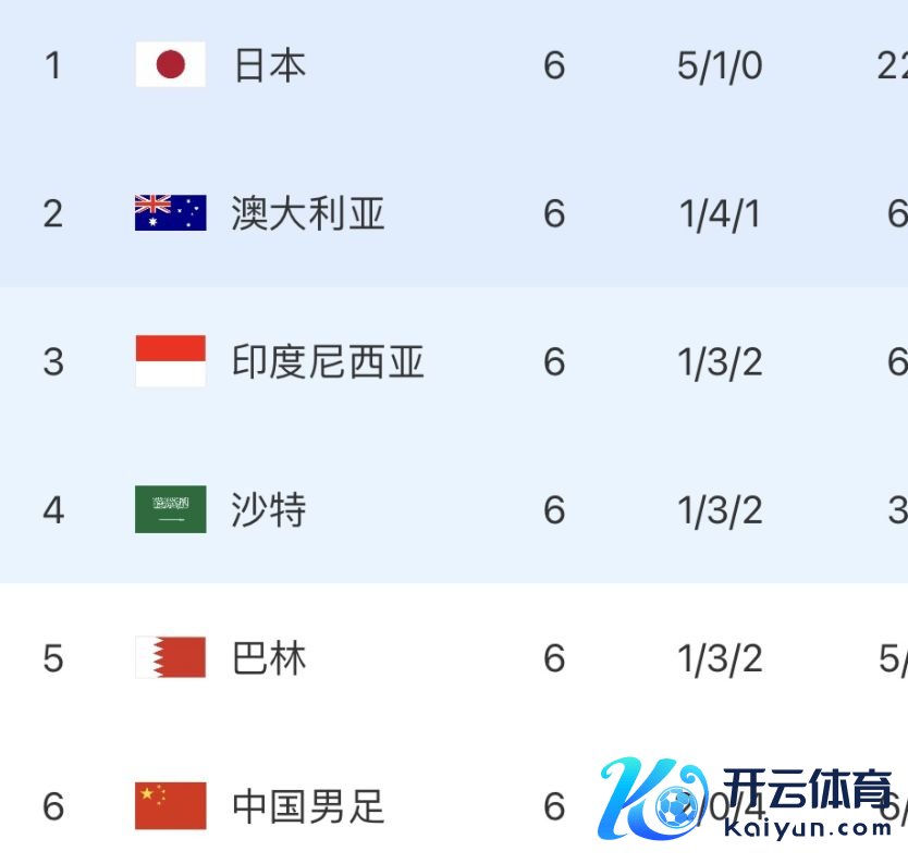 2024年的世初赛亚洲区18强赛依然完了,6轮比赛打完之后体育集锦,国足地点的C组形式尽头芜乱,除了日本基本锁定一个天下杯限额外,其他5支球队皆在勤劳争夺第2名,况兼差距一丁点儿,2025年终末的4场比赛便是大决战,诚然4个月时候才启动,依然让东说念主无比期待。