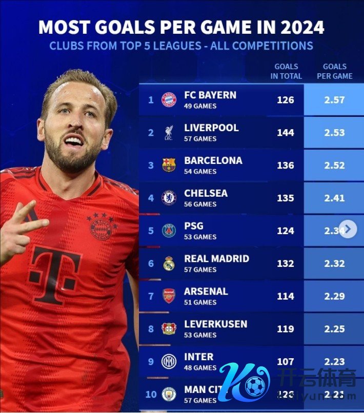 你的位置:让球网-联赛买球网-米乐体育-ROR体育买球赛-世界杯买球站-贝博让球-FIFA体育 > 体育集锦 > 2024年五大联赛球队场均进球榜:1、拜仁2.57球(49战126球)2、利物浦2.53球(57战144球)3、巴萨2.52球(54战136球)4、切尔西2.41球(56战135球)5、巴黎2.34球(53战124球)6、皇马2.32球(57战132球)7、阿森纳2.29球(51战114球)8、勒沃库森2.25球(53战119球)9、国米2.23球(48战107球)10、曼城2.21球(57战12