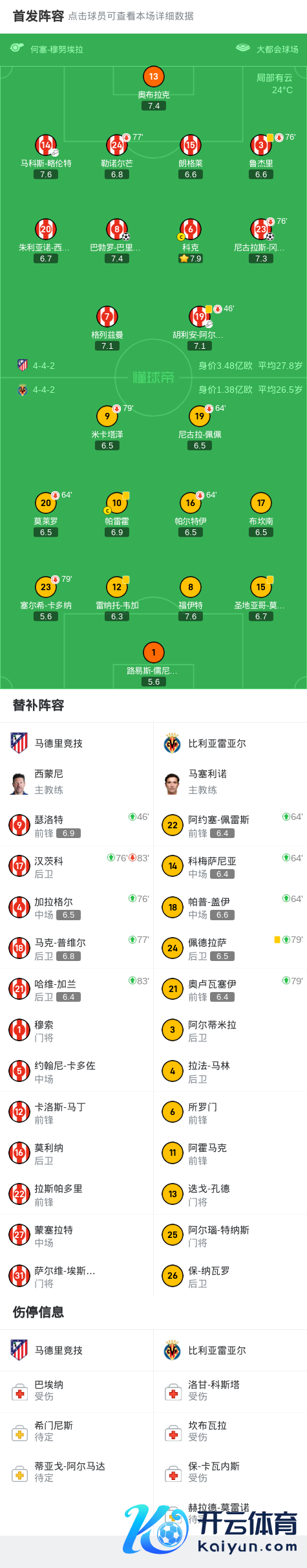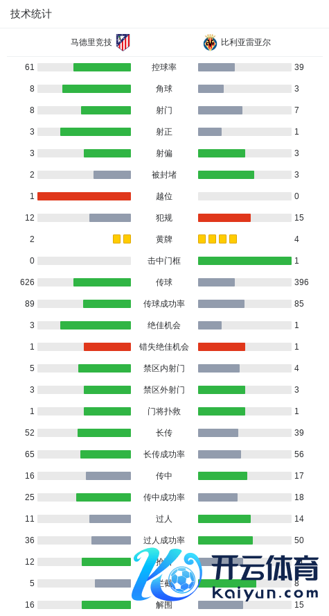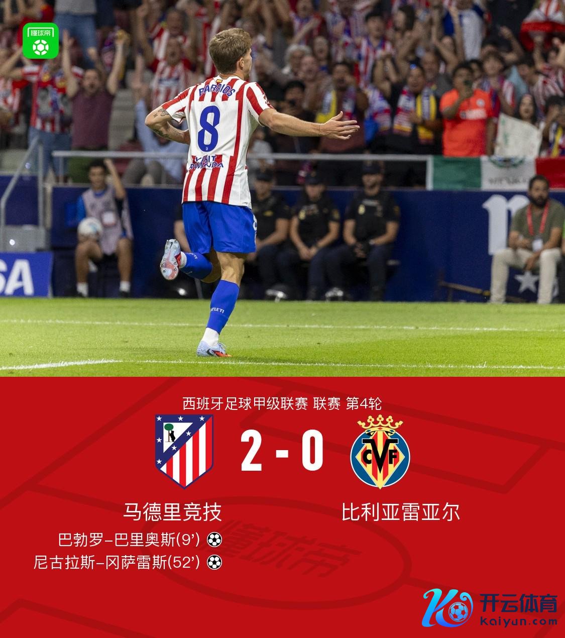 在9月14日进行的西班牙足球甲级联赛第4轮比赛中,马德里竞技镇守主场迎战比利亚雷亚尔。比赛运转后,马德里竞技速即参加现象,第9分钟,胡利安-阿尔瓦雷斯送出精确传球,匡助巴勃罗-巴里奥斯攻入一球,为主队赢恰当先。易边再战,马德里竞技络续掌控比赛节律,第52分钟,马科斯-略伦特送出助攻,尼古拉斯-冈萨雷斯拖拉破门,将比分扩大为2比0。尔后两边均未能改写比分,马德里竞技以2比0的比分完胜比利亚雷亚尔。