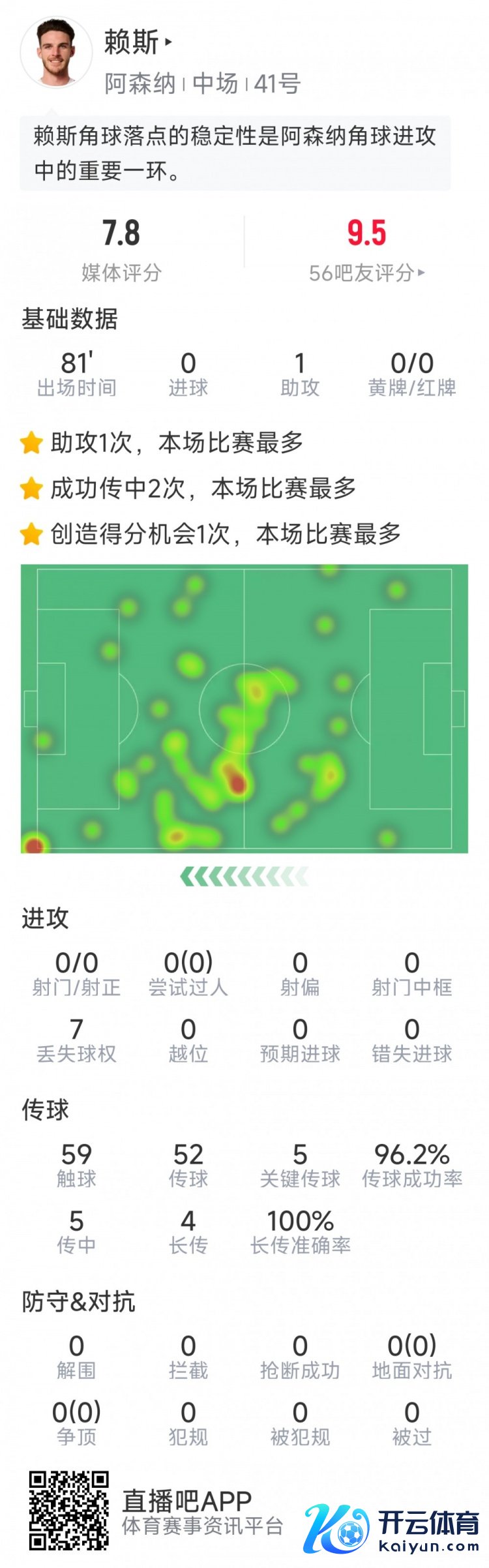 以下为赖斯本场数据:比赛技巧81分钟1次助攻0射门59次触球5次重要传球传球得手率96%4次长传均得手评分7.8分 体育录像/图片