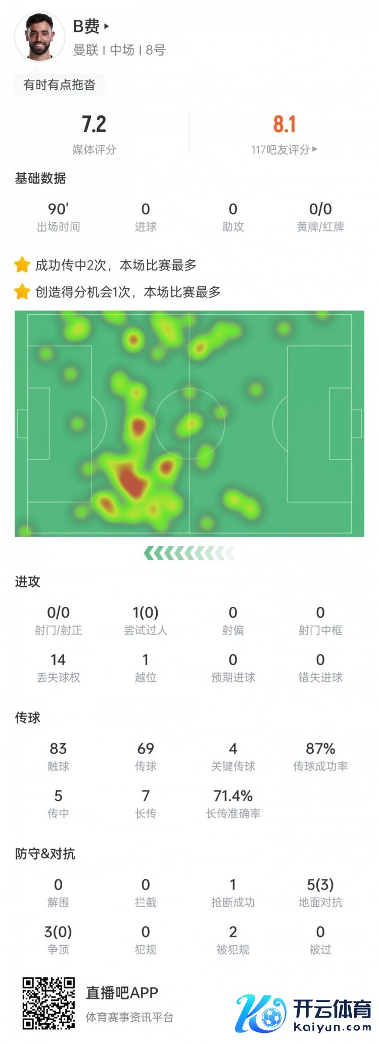 B费本场比赛数据:出场时间——90分钟尝试过东谈主——1(生效0)丢失球权——14越位——1触球——83传球——69要害传球——4传球生遵守——87%传中——5长传——7(准确率71.4%)抢断生效——1大地叛逆——5(生效3)争顶——3(生效0)被犯规——2媒体评分——7.2 体育录像/图片