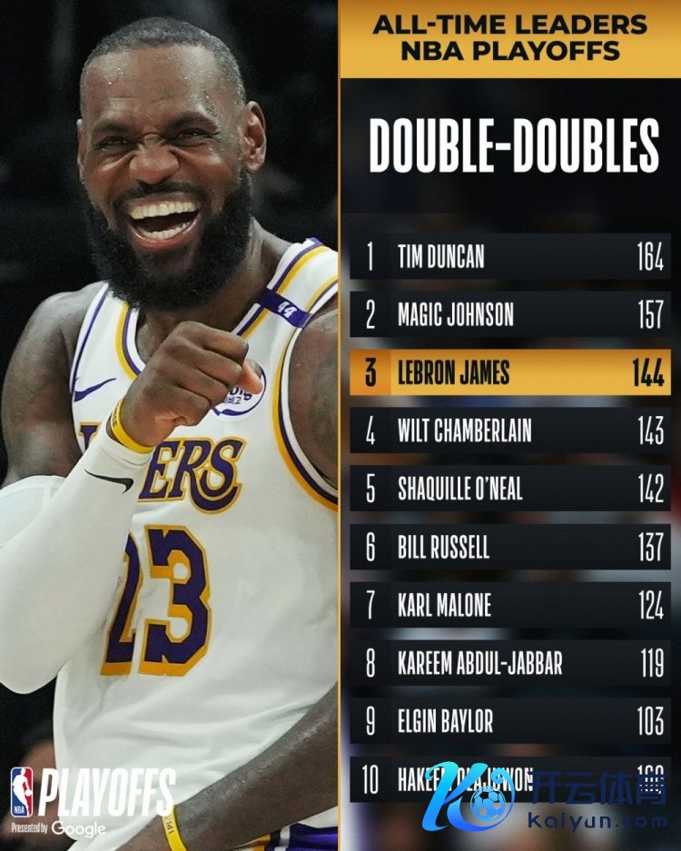 据统计,这是詹姆斯季后赛生活拿到的第144个两双体育赛事直播,卓绝张伯伦独占历史第三,仅次于邓肯(164)和魔术师(157)。