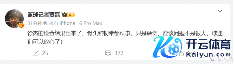 那么说徐杰当今伤情何如样了?不妨来望望篮球记者贾磊的报谈,赛后第一技术,贾磊就公布了徐杰的最新伤情诠释,好音书是,徐杰的骨头和韧带都没事,仅仅硬伤,贾师父合计徐杰应该问题不是很大,球迷们不错省心了!