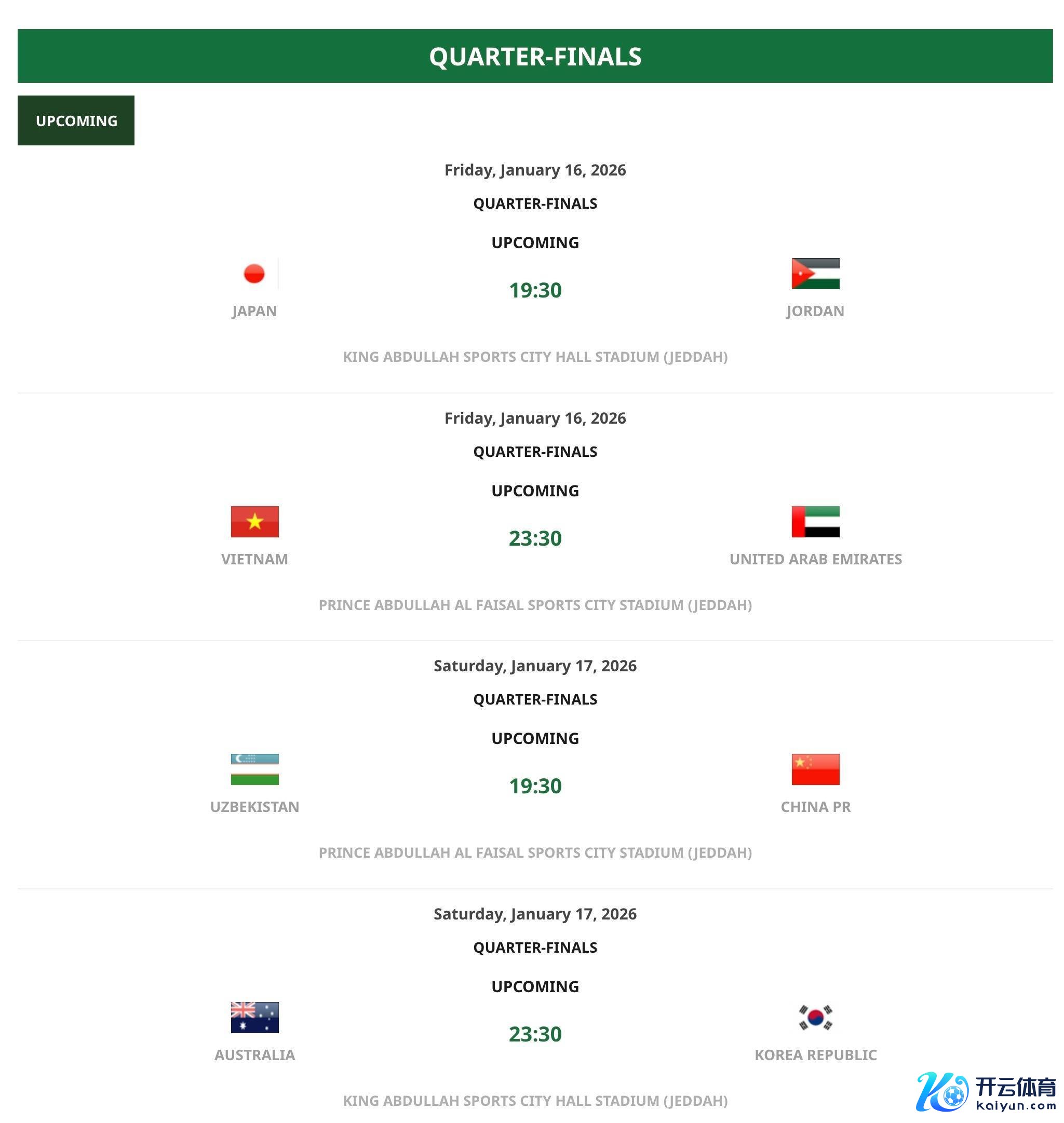 八强对阵,图中标注的开球本领均为北京本领。图源:亚足联官网积分榜上,D组澳大利亚队2胜1负积6分赢得小组第一,中国队1胜2平积5分排行第二;A组越南队三场全胜积9分排行小组第一,约旦队积6分排行第二;B组日本队三战全胜进10球失0球名列榜首,阿联酋队积4分排行第二;C组乌兹别克斯坦队2胜1平积7分排行第一,韩国队积4分排行第二。