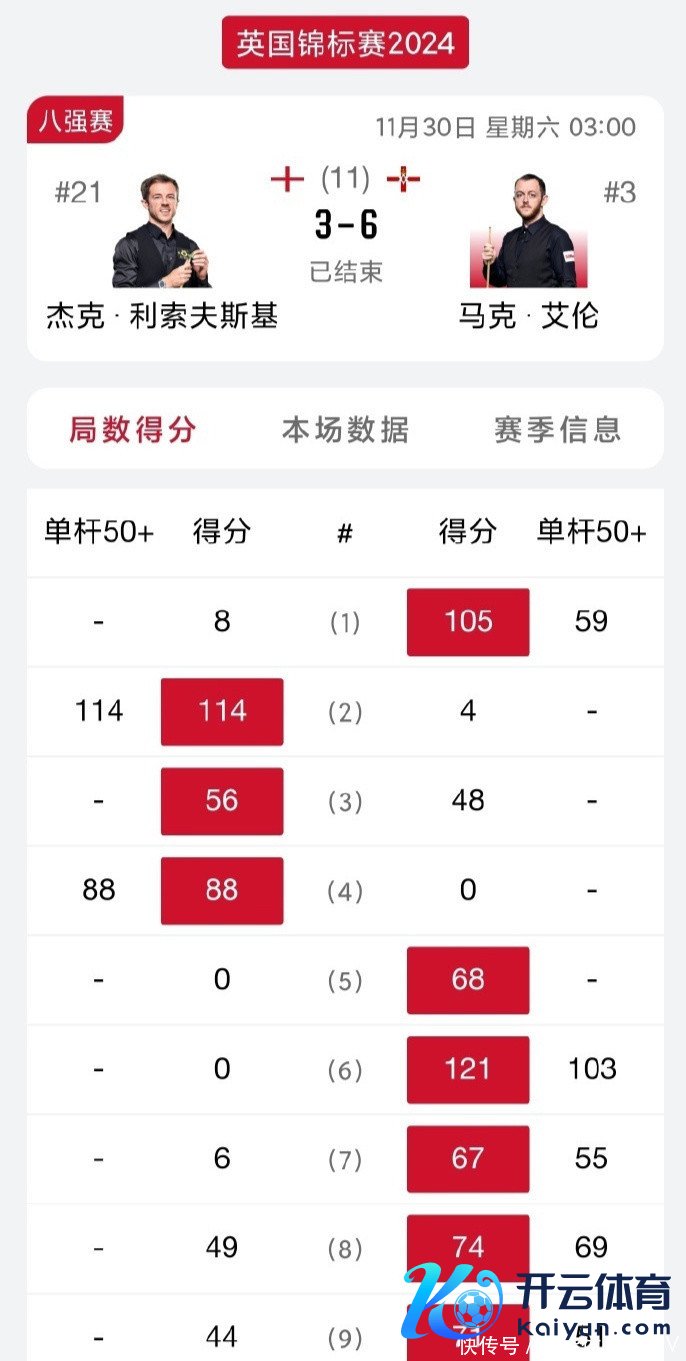 第八局,利索夫斯基单杆70分制胜,70-55赢下,4-4再次追平比分,两边回到同沿途跑线。第九局,利索夫斯基又打出单杆61分,82-44再胜一局,5-4反超比分并获取赛点。