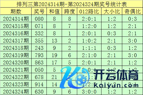 开奖回来:成列三第2024324期奖号开出:630体育赛事直播,组选类型:组六,大小比为1:2,奇偶比为1:2,和值为9,跨度为6。