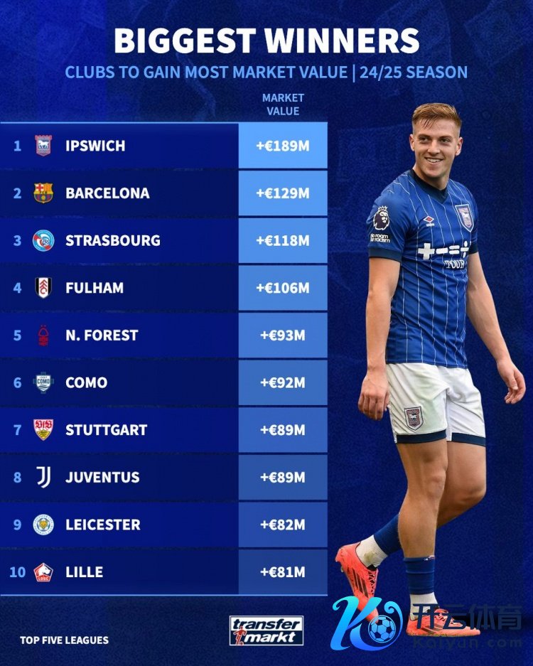 本赛季五大联赛总身价高潮最多球队:1、伊普斯维奇:+1.89亿欧2、巴萨:+1.29亿欧3、斯特拉斯堡:+1.18亿欧4、富勒姆:+1.06亿欧5、诺丁汉丛林:+9300万欧6、科莫:+9200万欧7、斯图加特:+8900万欧8、尤文图斯:+8900万欧9、莱斯特城:+8200万欧10、里尔:+8100万欧 体育赛事直播